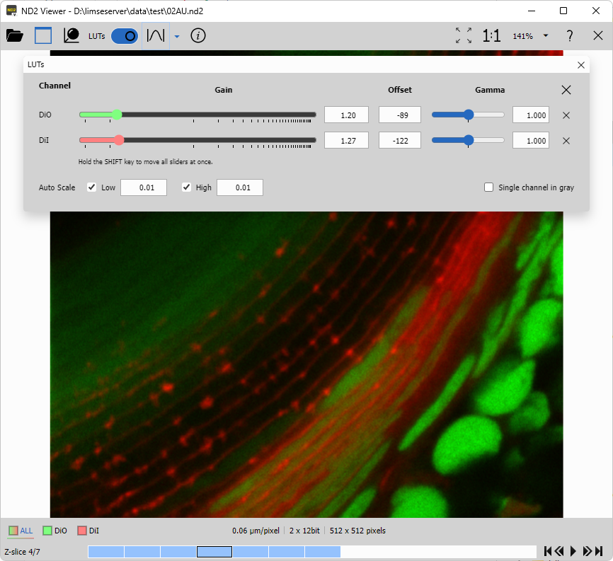 The ND2 viewer is a simple visualizer of ND2 files produced by NIS Elements software.